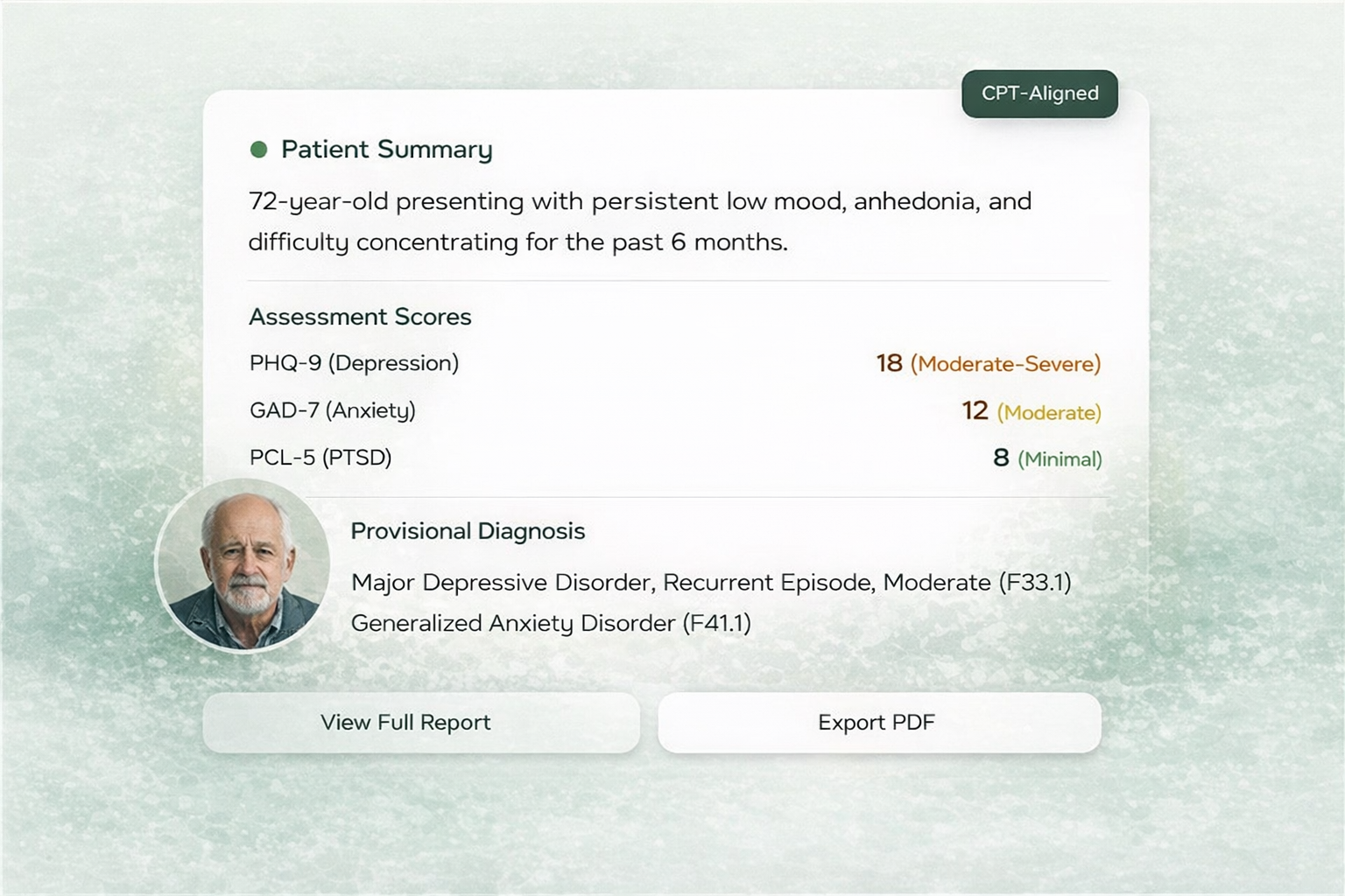 Assess is the first step. It gives you a coherent, whole-person picture of each patient before you walk into the room and generates CPT-aligned artifacts for psychiatric evaluations and psychological testing. The first minute can be clinical, not just administrative.
